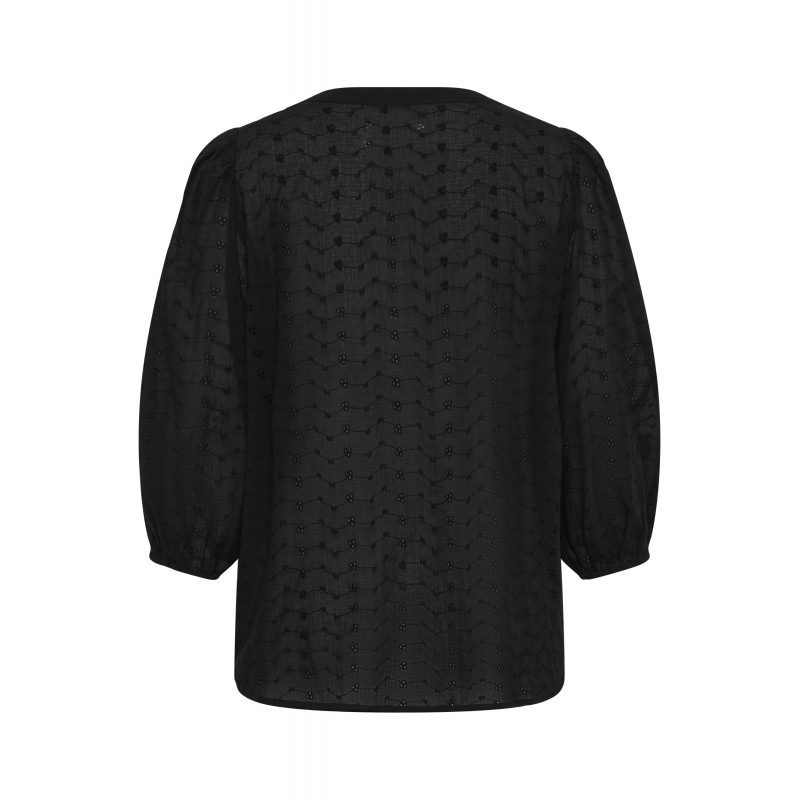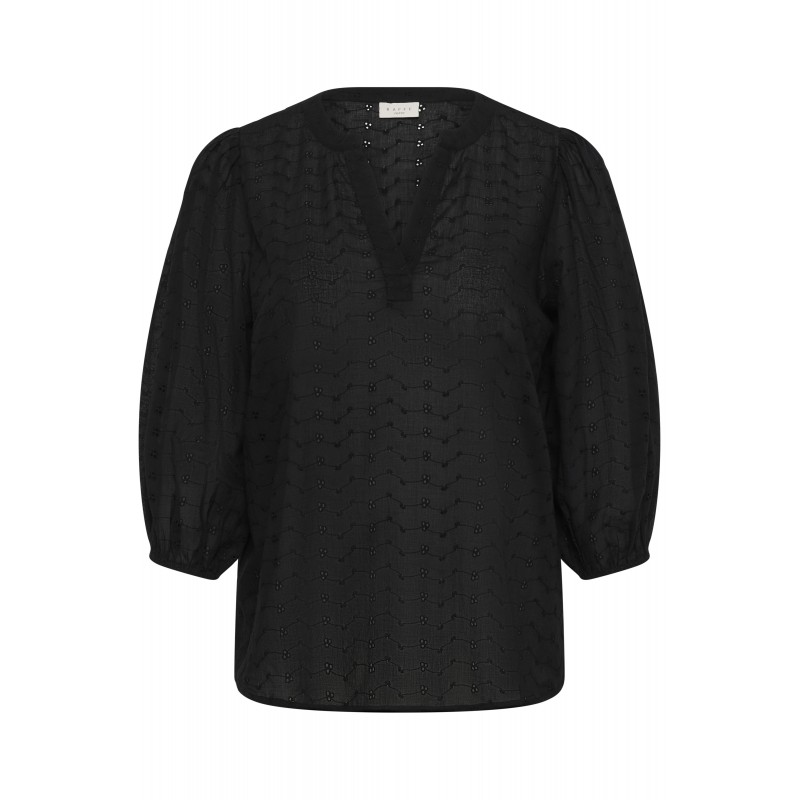 Sød bluse i en dejlig bomuldskvalitet, med et fint broderet hulmønster. KCmaia blusen har V-udskæring og er med 3/4 ærmer der giver en lille pufeffekt og afsluttes med elastik kant.