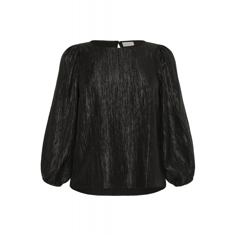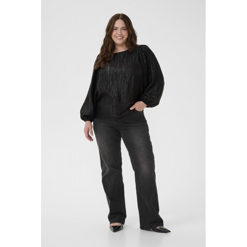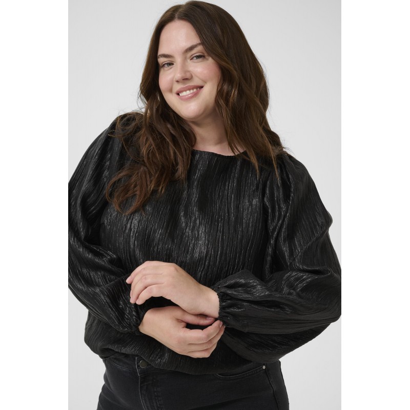 KCrizza er en smuk bluse fra Kaffe Curve. Blusen har en løs pasform og markante ballonærmer for et moderne look. Rund halsudskæring og let glans giver et elegant touch, velegnet til hverdag og festlige lejligheder