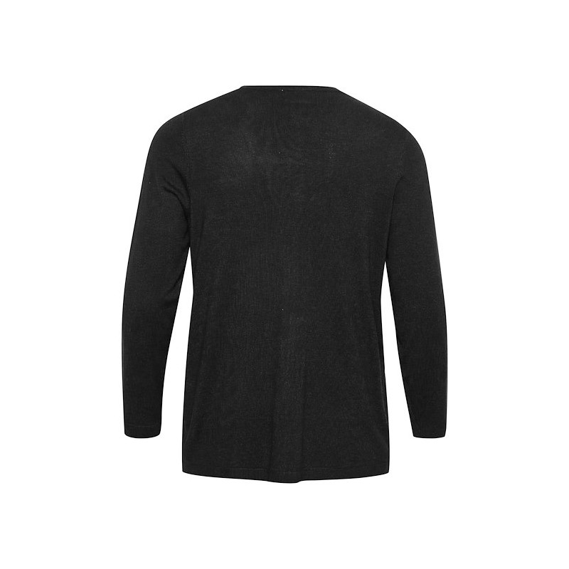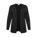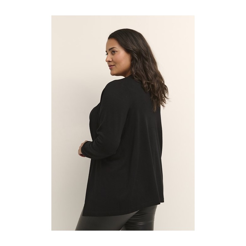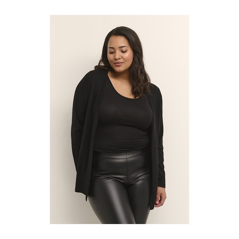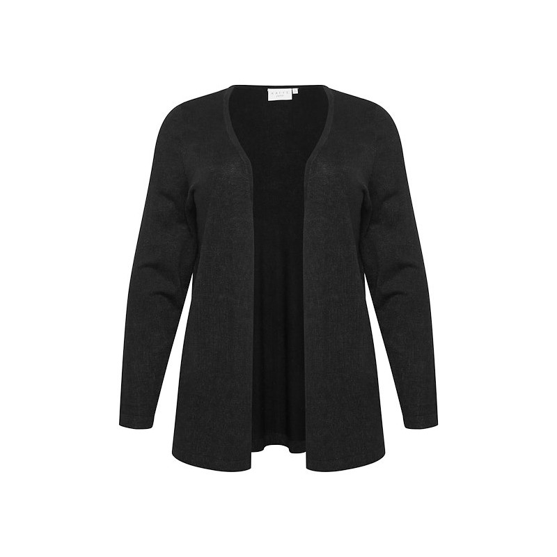 Enkel og klassisk sort cardigan fra Kaffe Curve med en fin længde ned over hoften. Cardiganen er lavet i en blød let viskose strik og har lange ærmer. Modellen er løsthængende uden knaplukning.