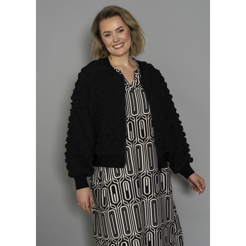 Smart kort jakke med fine detaljer. Modellen har krave og lukning foran med lynlås, hvilket giver ekstra funktionalitet. De lange ærmer og de praktiske lommer understøtter det anvendelige design, mens den sorte farve sikrer et tidløst og alsidigt look, der passer til enhver garderobe.