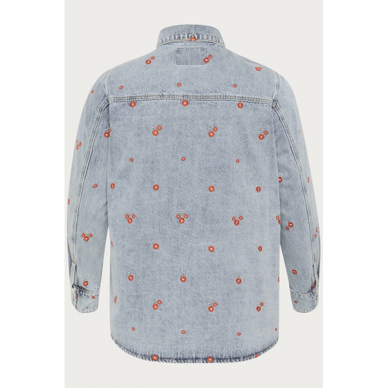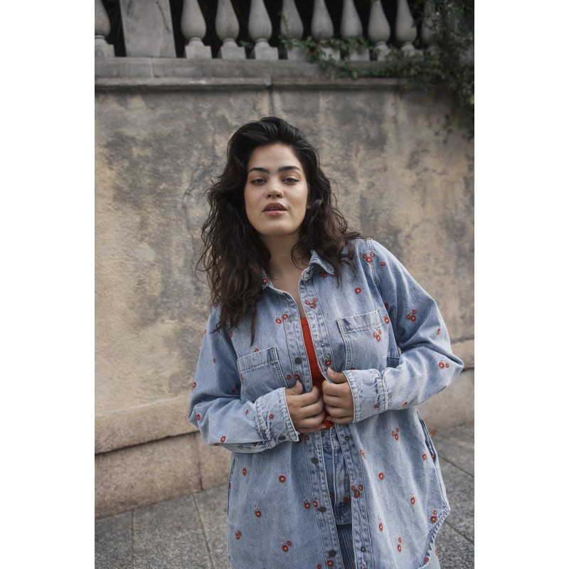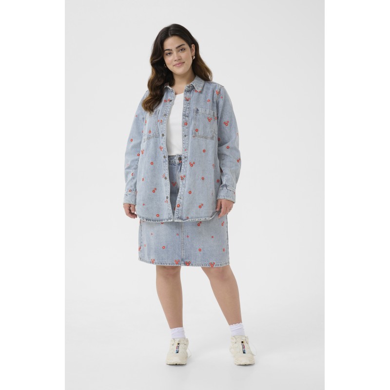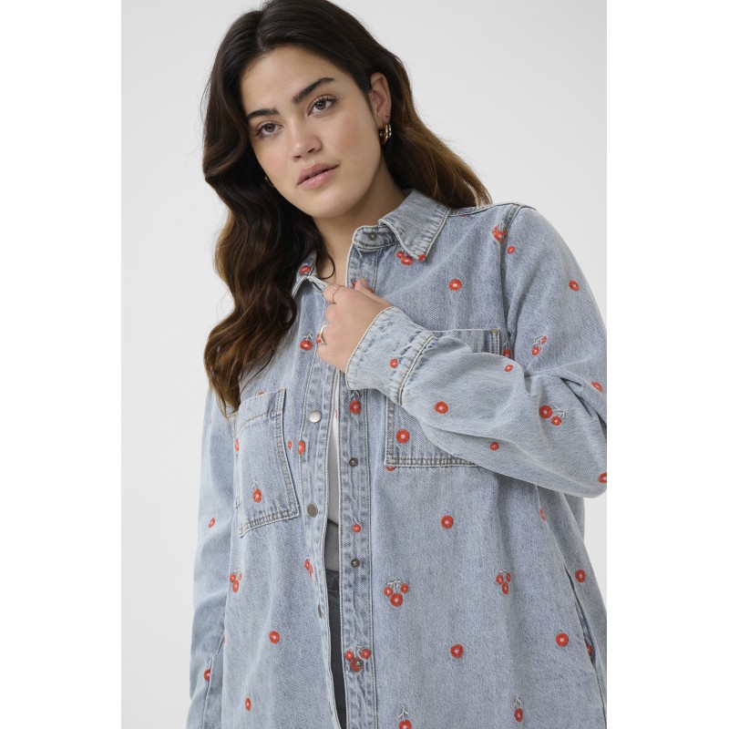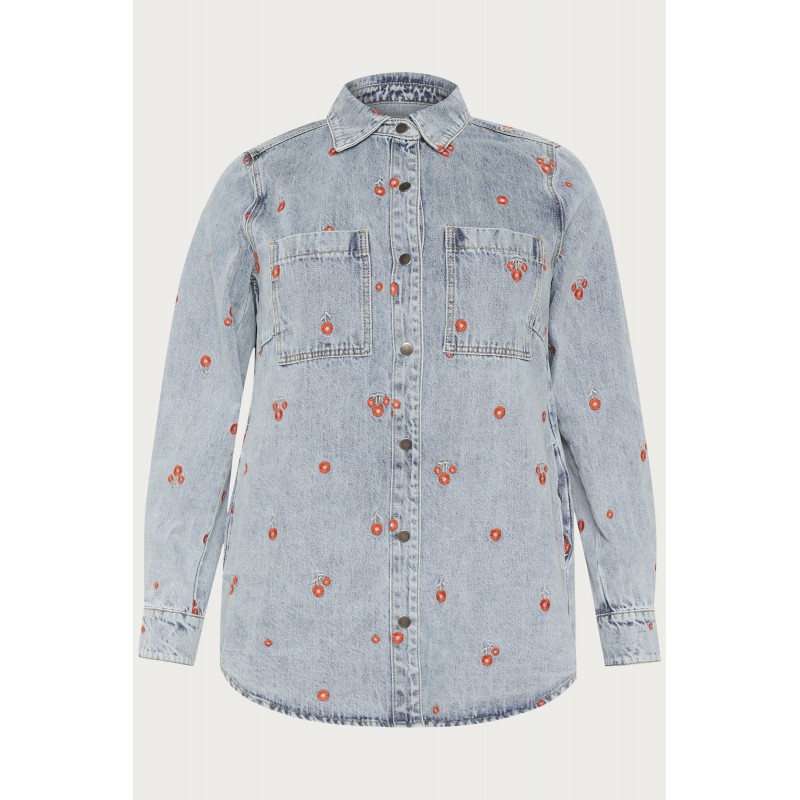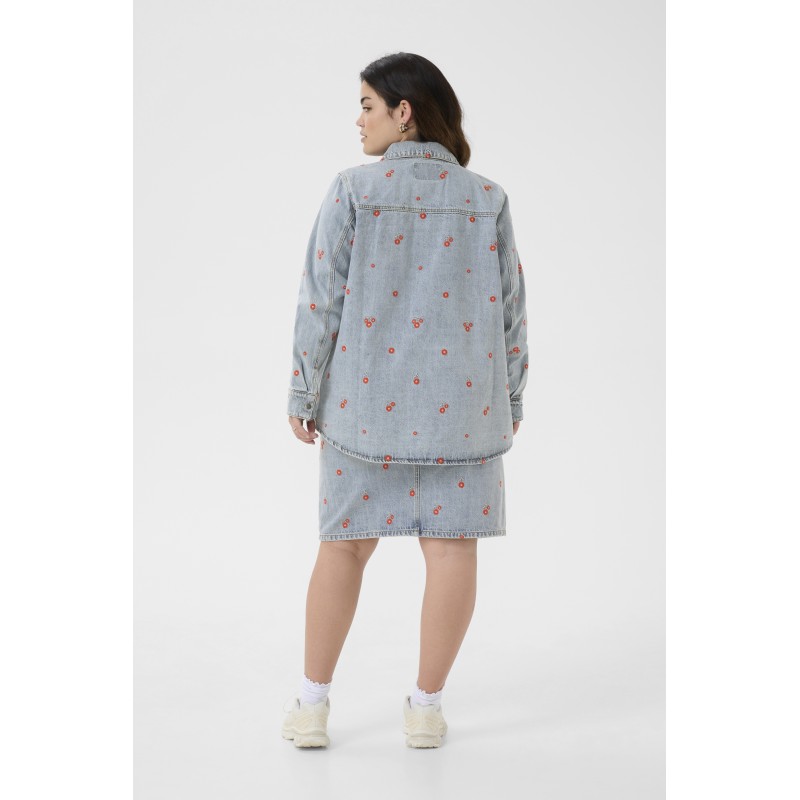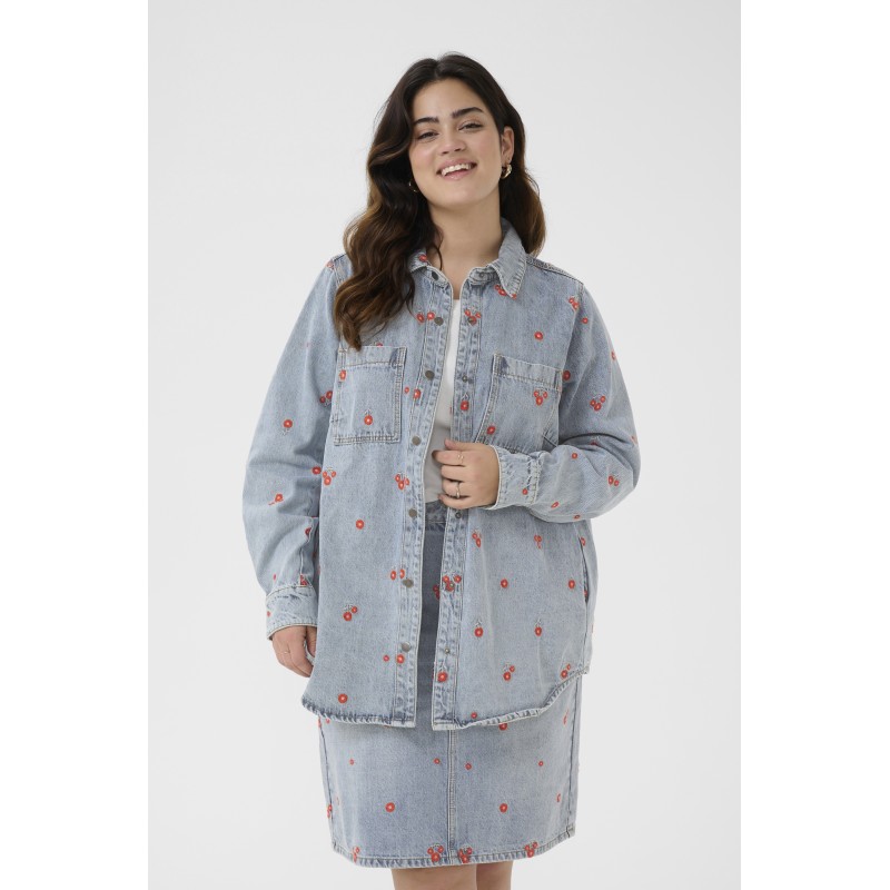 Super smart lys denim jakke fra Kaffe Curve med fine broderede blomster på i røde farver. Jakken har en sød skjorte facon og er gennemknappet med trykknapper. Den er i en fed lys vask med de skønneste broderede blomster.