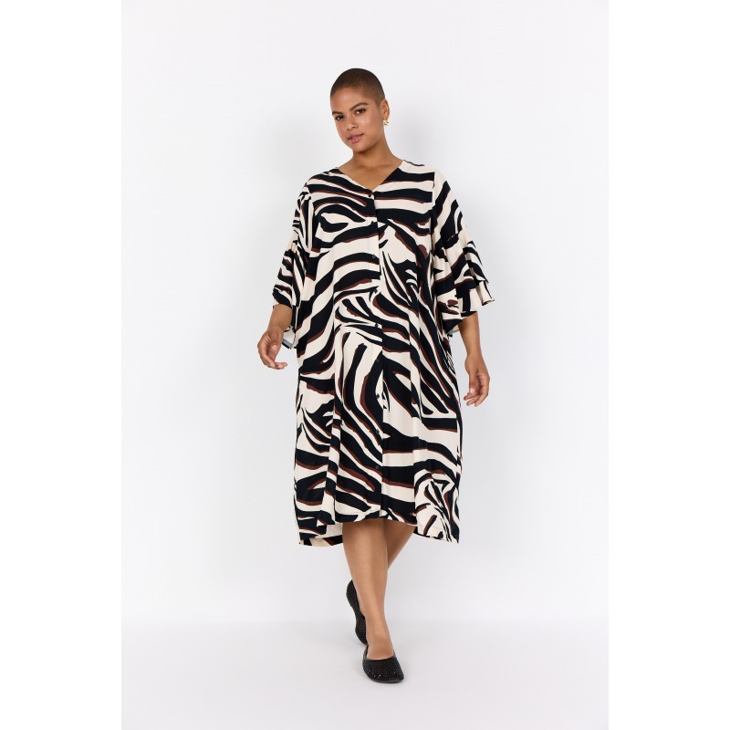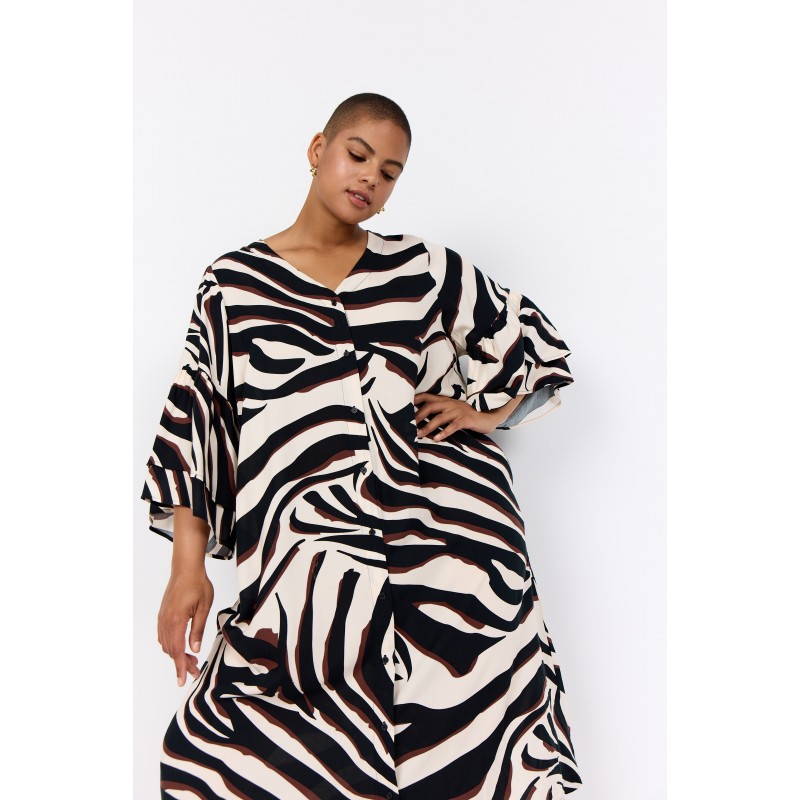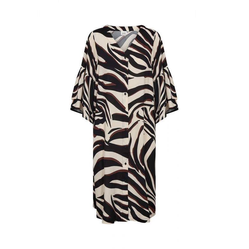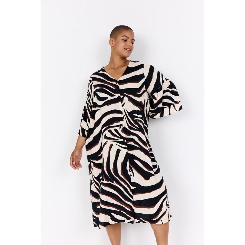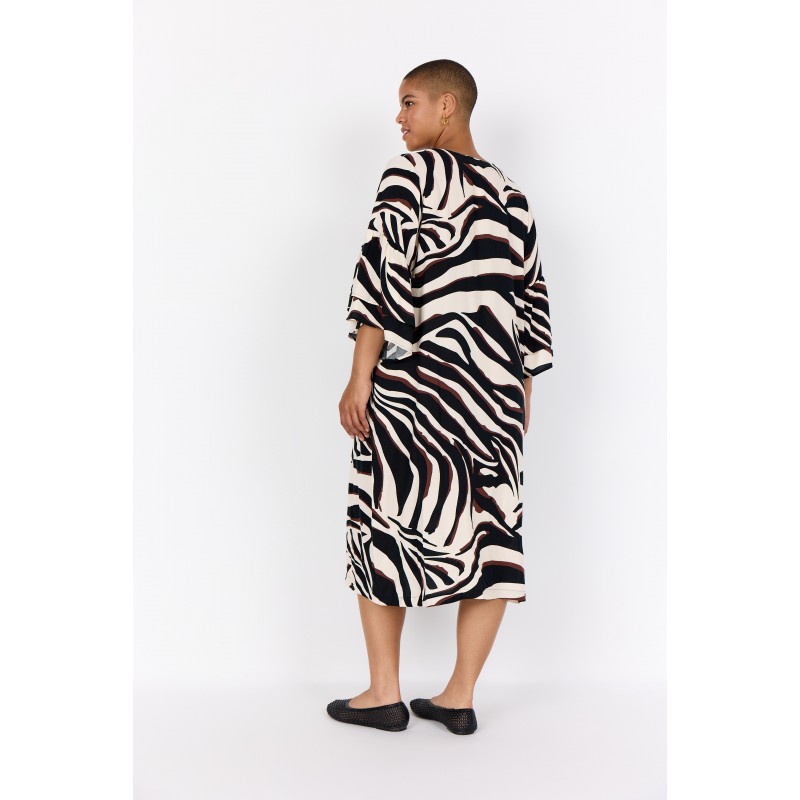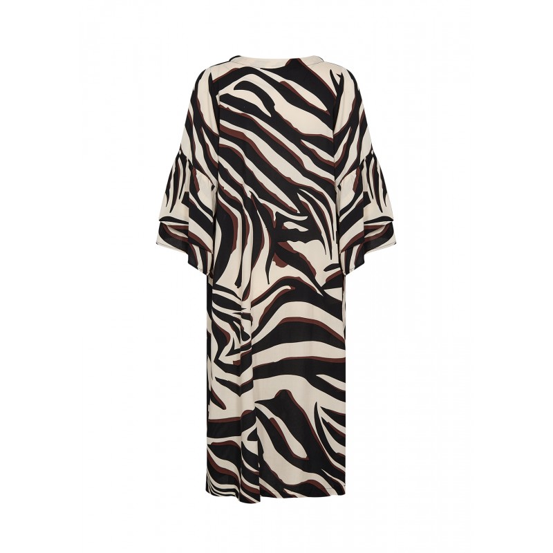 WA-SALMA 4 er en smuk kjole fremstillet af 100 % LENZING™ ECOVERO™-viskose. Kjolen har en stilfuld V-hals med knaplukning og et iøjnefaldende zebraprint. Sæt den sammen med sandaler for et afslappet look eller støvler for et modigt statement.