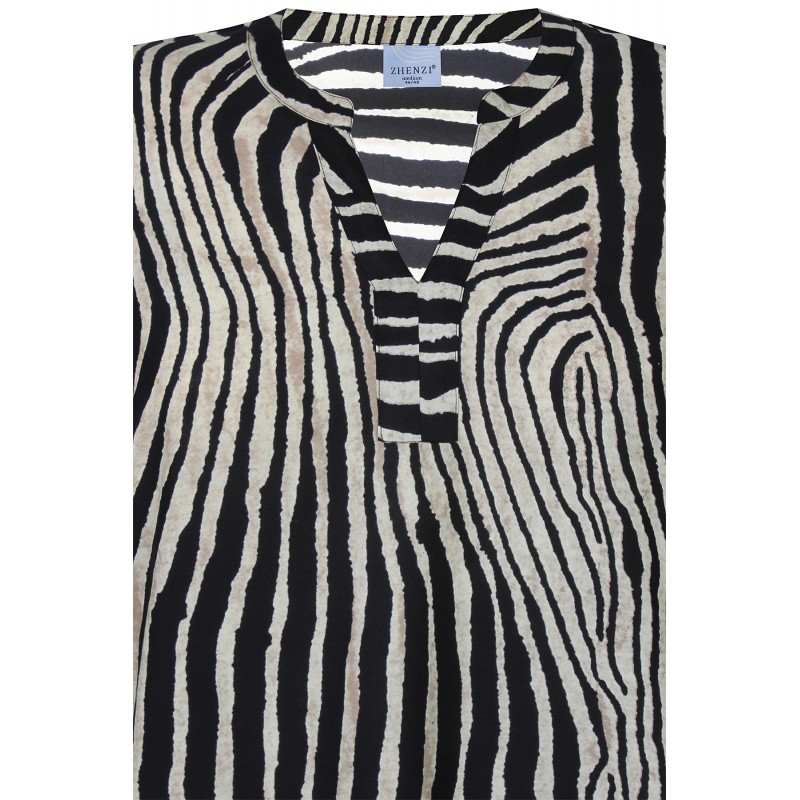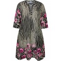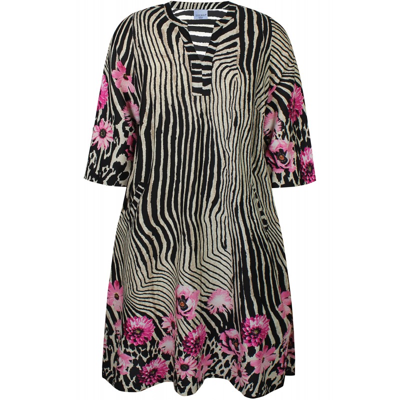 Skøn kjole fra Zhenzi med det fineste dyreprint og blomster i smukke farver. Kjolen har v-hals, 3/4 ærmer med lift up knap og slidser i siden.