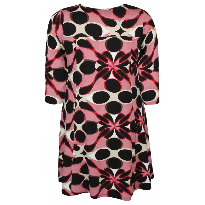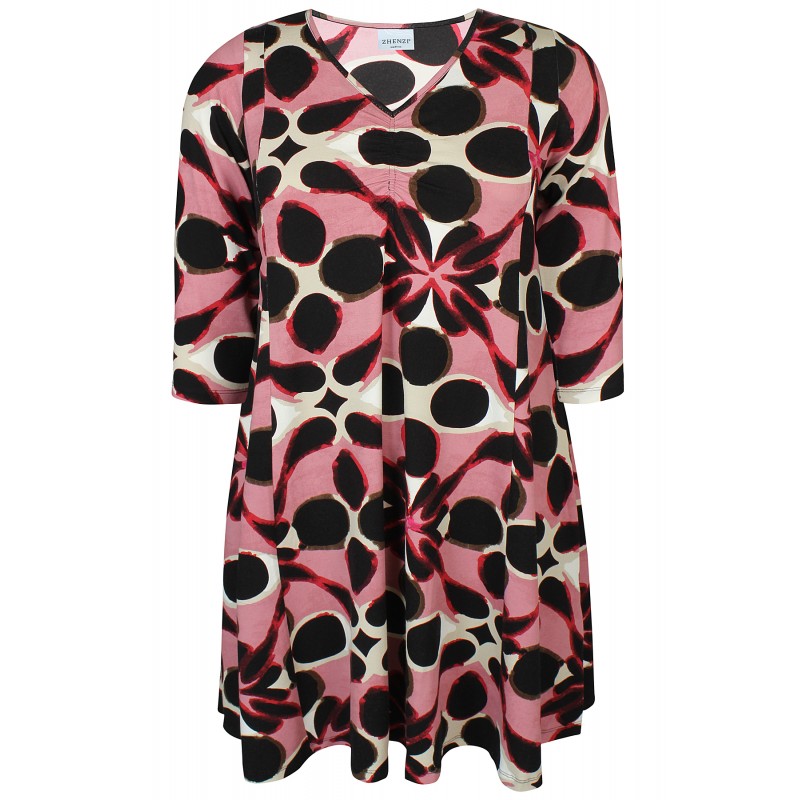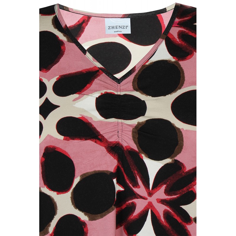 Blød og skøn printet kjole fra Zhenzi i viskose jersey. Zh-Octa kjolen har v hals med en fin rynke detalje ved brystet. som gør at den sidder flot. Kjolen har 3/4 ærmer og har en facon syet pasform.