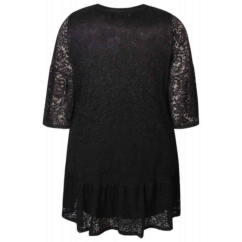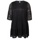 Flot sort kjole i strækbart blonde materiale med viskosejersey underkjole. Den løse A-facon giver plads til bevægelse, og dens to-lags konstruktion falder roligt omkring kroppen. Lille V-halsudskæring og 3/4-klokkeærmer giver et luftigt udtryk.
