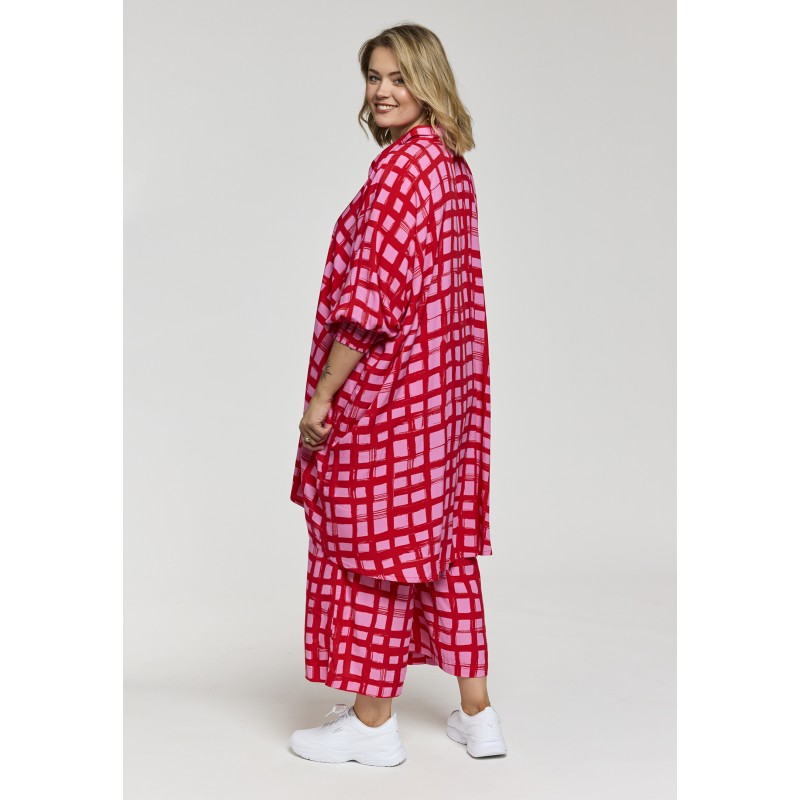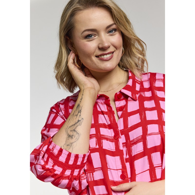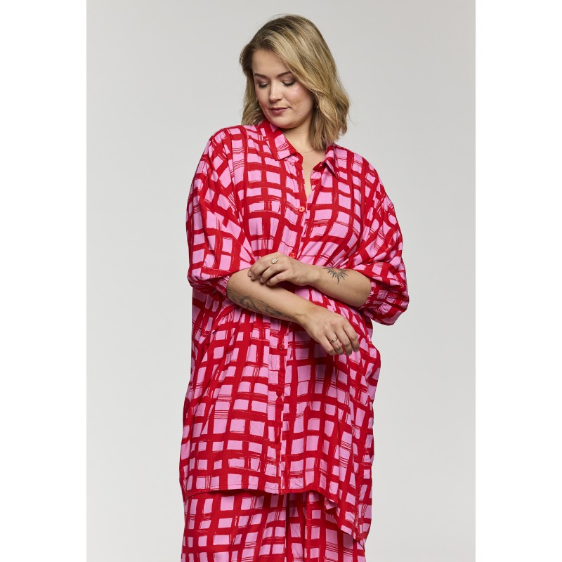 Lækker oversize skjorte kjole/tunika fra Gozzip i en skøn viskose kvalitet i smukke røde og pink farver. Tunikaen er gennemknappet med 3/4 ærmer der afsluttes med en bred smock elastik. En let og luftig kjole/tunika perfekt udenpå stramme bukser eller som kjole med en underkjole under.