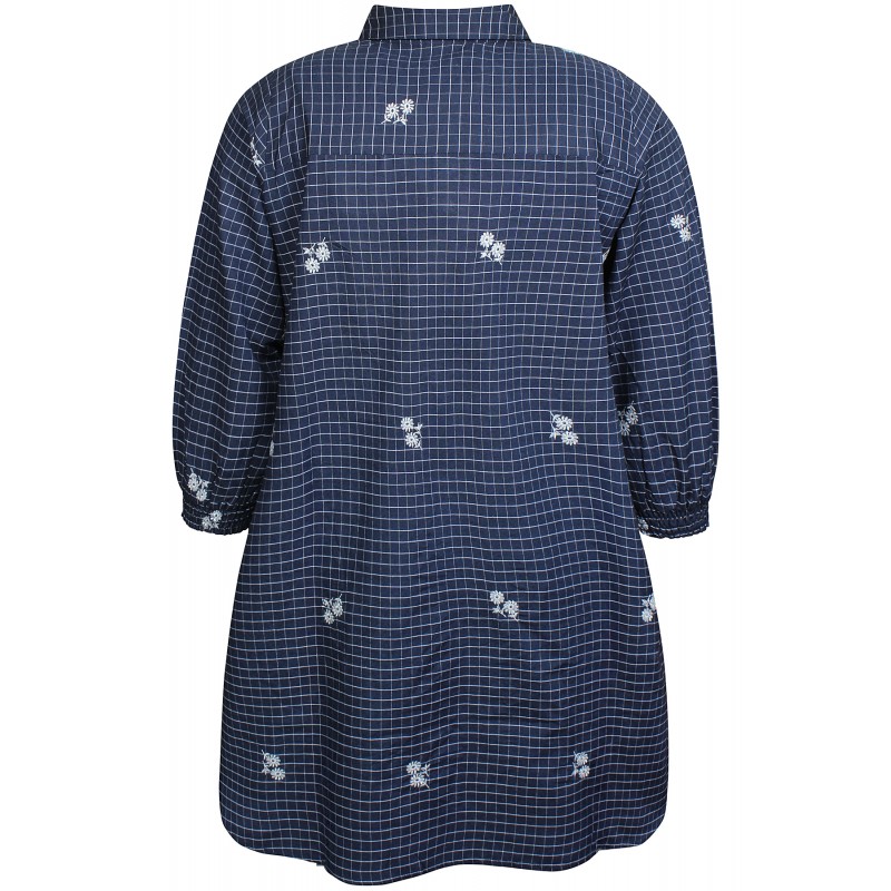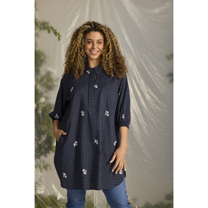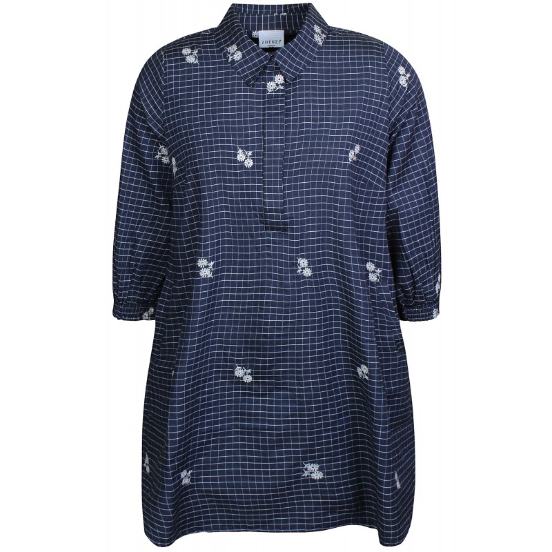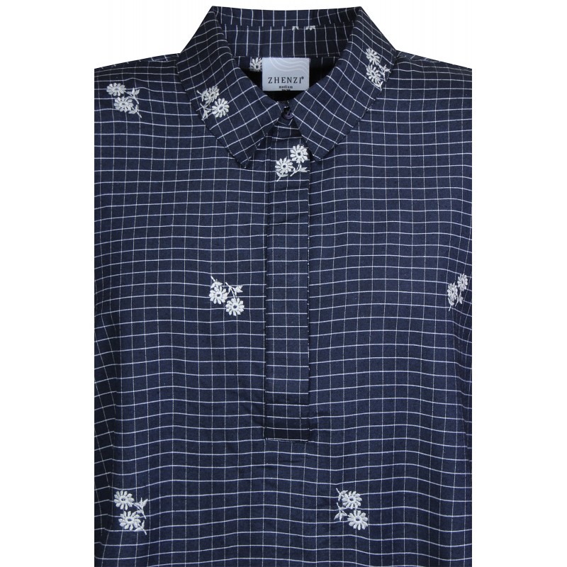 Zh-Amber tunic er en marine blå tunika med hvide tern og hvide broderede blomster. Tunikaen har stolpelukning og en klassisk krave. Den har 3/4 lange ærmer med smock, lommer og har slidser forneden.