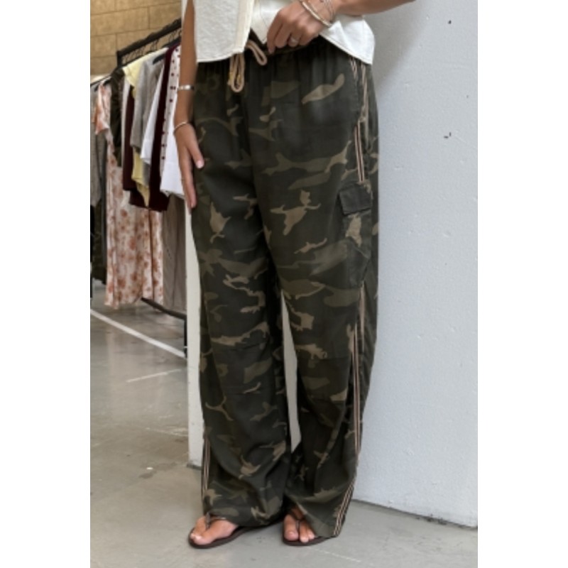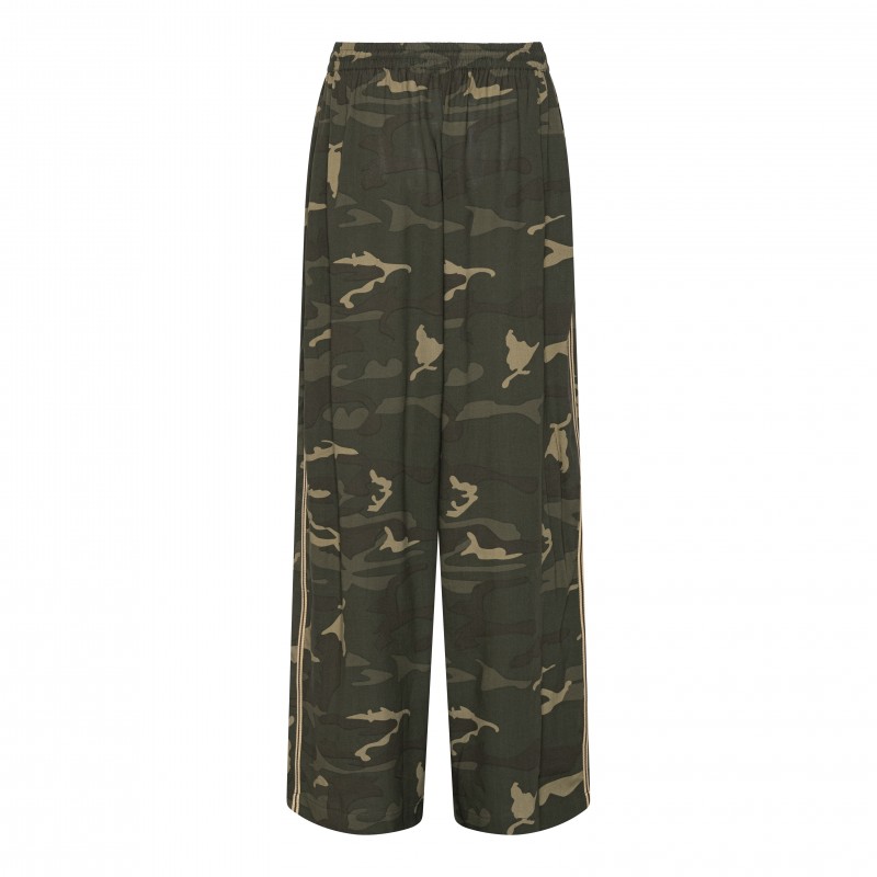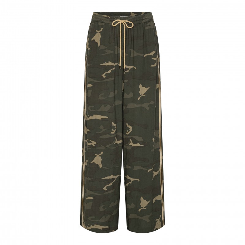 Lækre army printede bukser fra CONTINUE med en løs afslappet pasform. Mable bukserne har elastik i livet og snøre samt en smart piping langs med benet i siden.