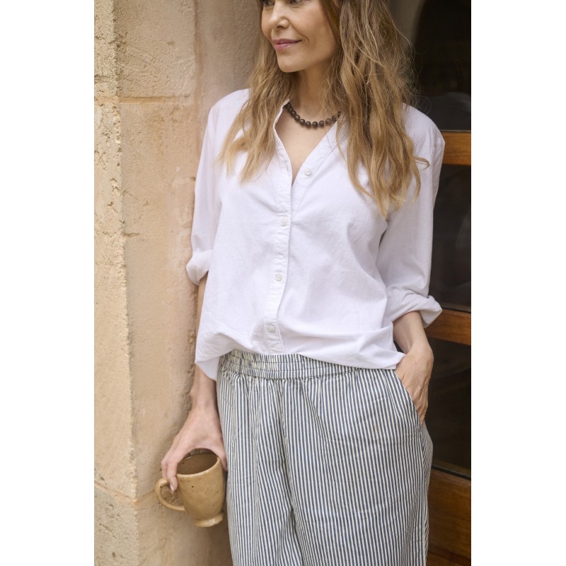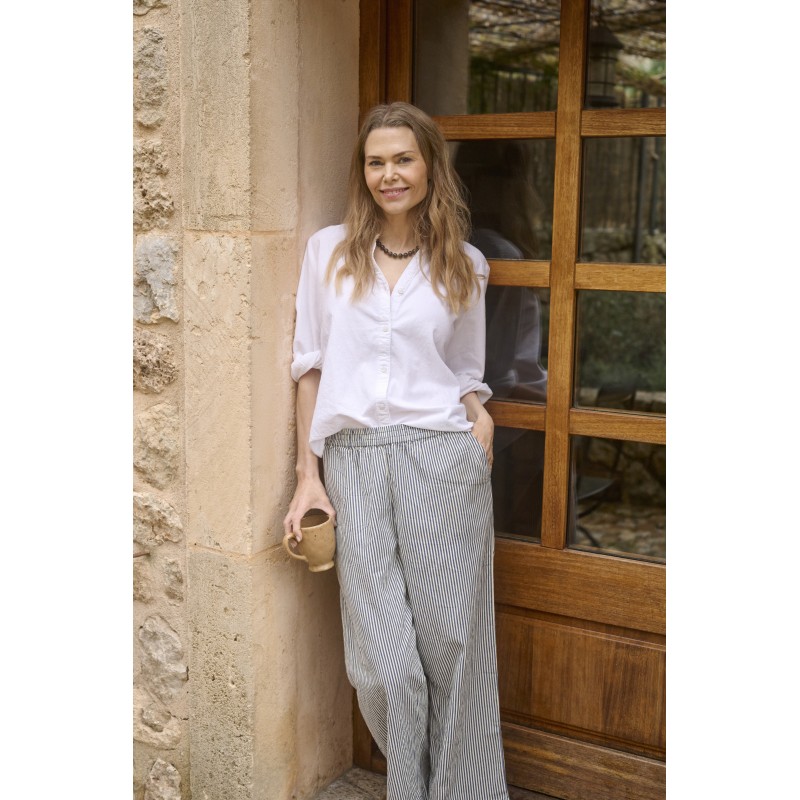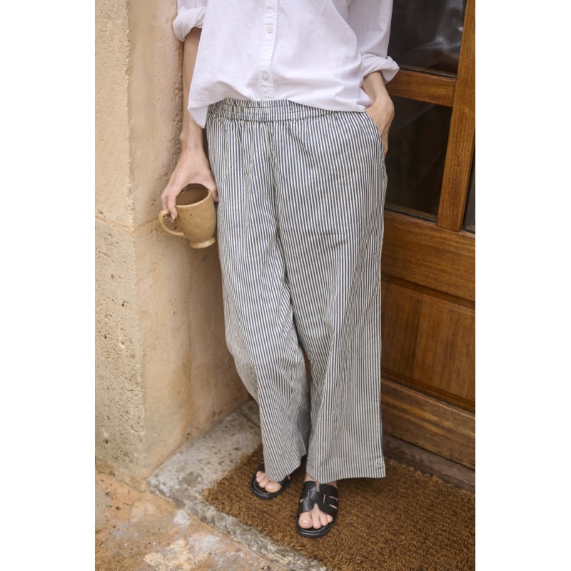 Super blød og behagelig stribet bomulds buks fra Kaffe. Buksen har vide ben, lommer og elastik i taljen.