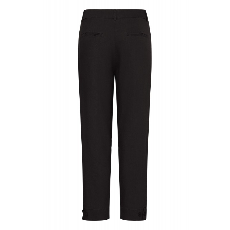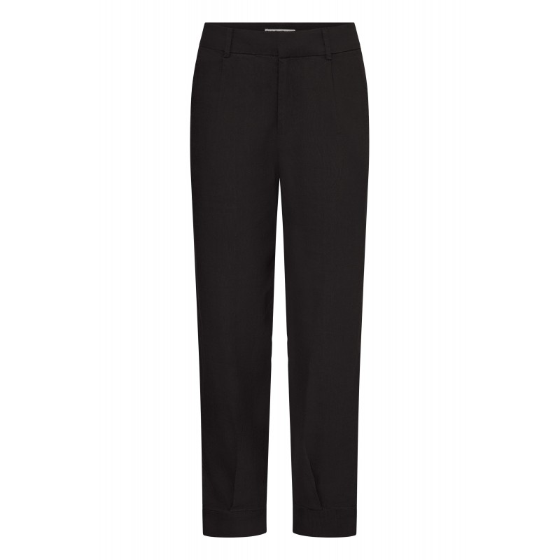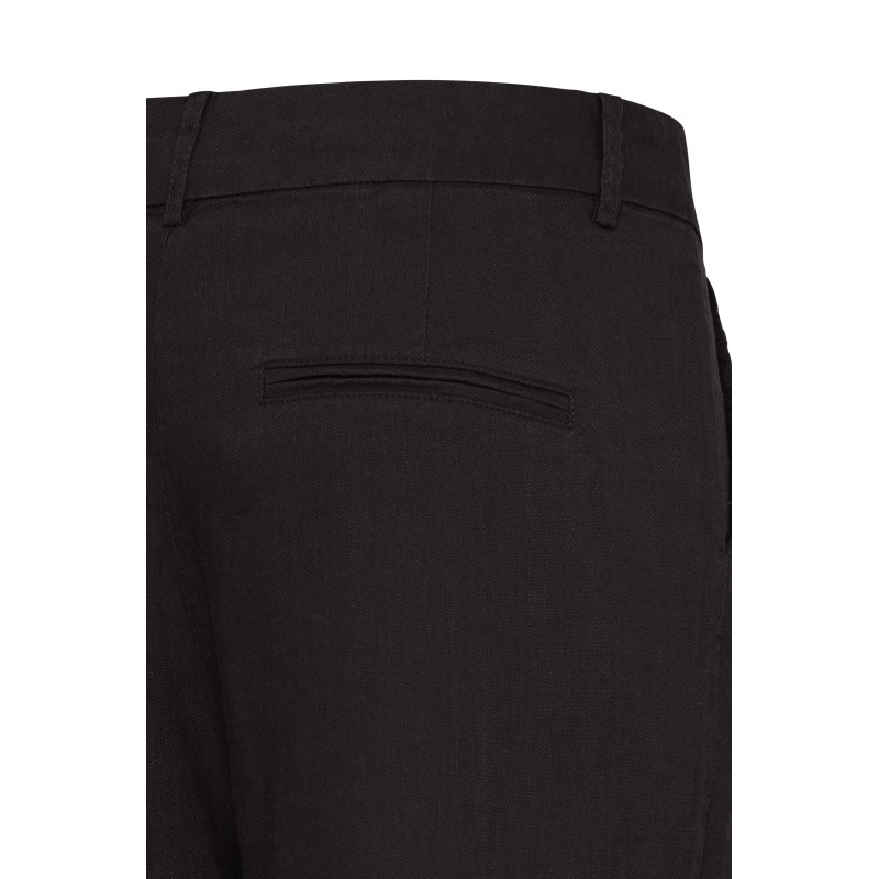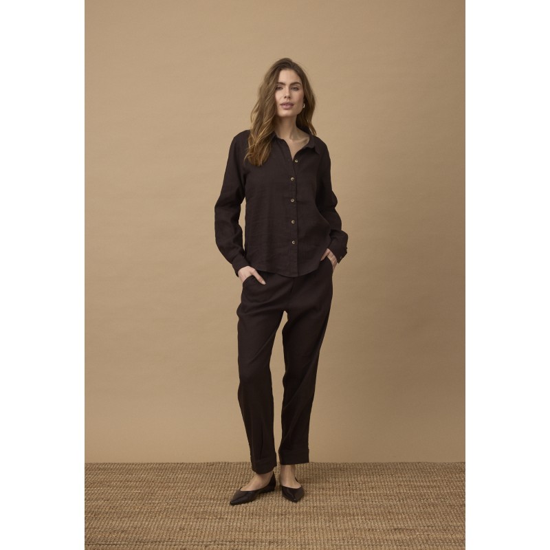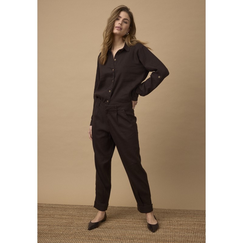 Flot brun buks i en skøn hør og viskose blanding, der er behaglig at have på. PZLUCA buksen er med fast linning, bælte stropper og knap og lynlås. Fine detaljer med læg og bred kant nederest.