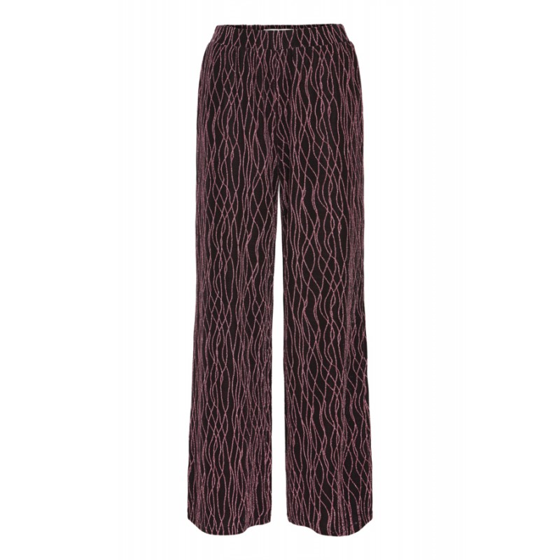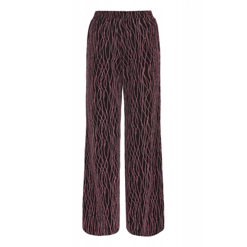 Smarte bukser med vidde og et flot rosa glimmer lurex mønster. PZTHEA bukserne har elastik i livet og vidde i benene, de er lavet i en elastisk kvalitet.