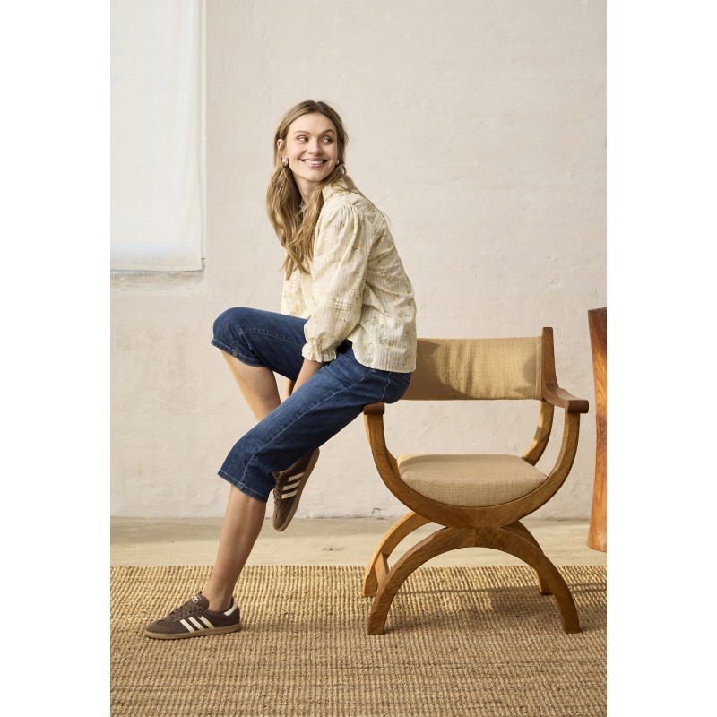 Denim capri buks med lige pasform, fem lommer og knælængde. Bæltestropper og synlige stikninger giver et afslappet, struktureret look.