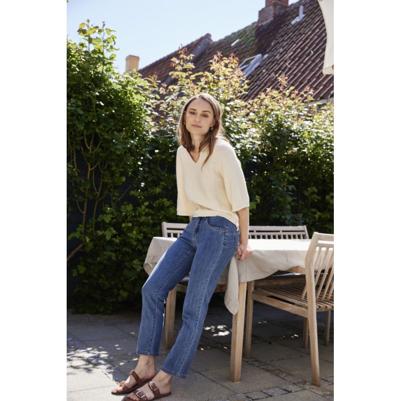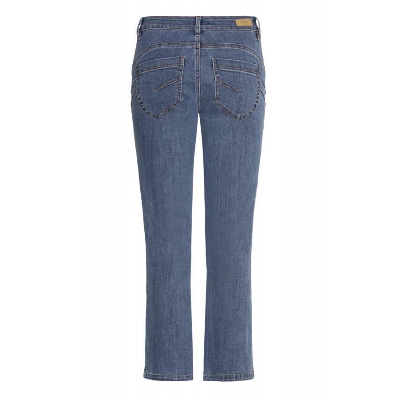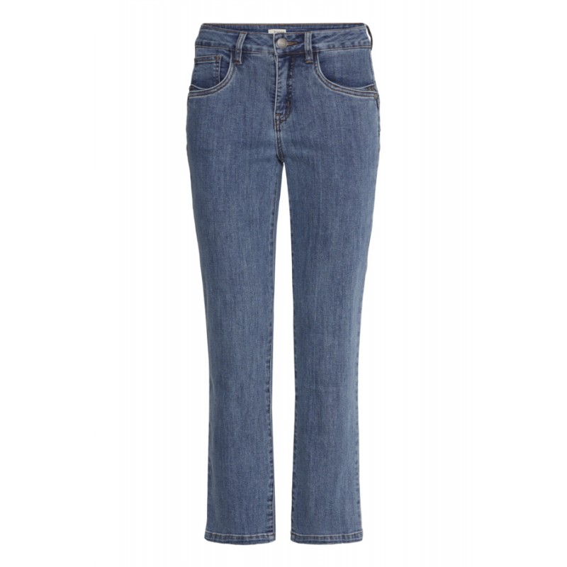 Smart jeans fra Fransa i en flot medium blå vask. FRATLANTA jeansen har midwaist taljehøjde og er i en ankel længde. Modellen har en regular benvidde.